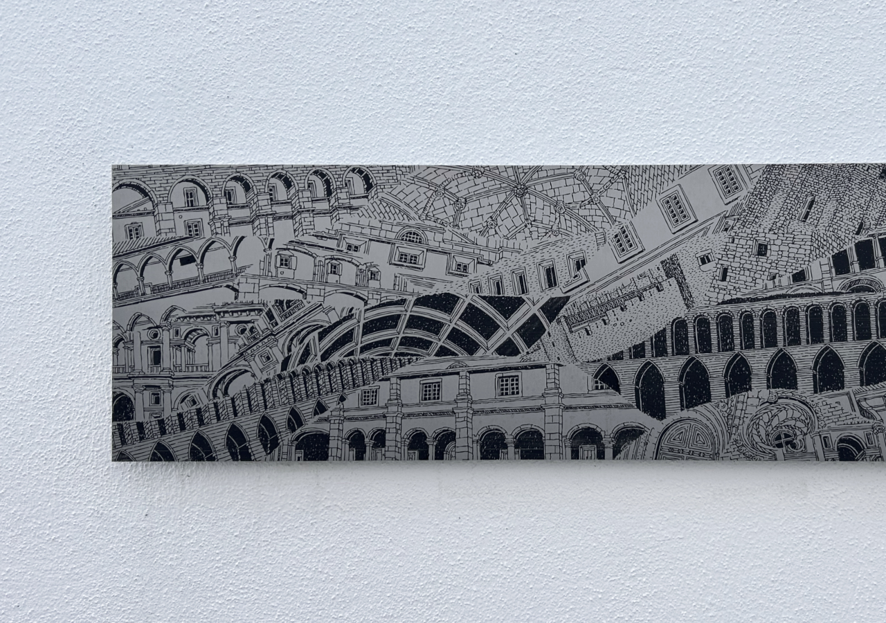 Draw by hand and then engraved in stainless steel plates, Eidos is a drawing that represents five themes from Tomar's urban landscape.