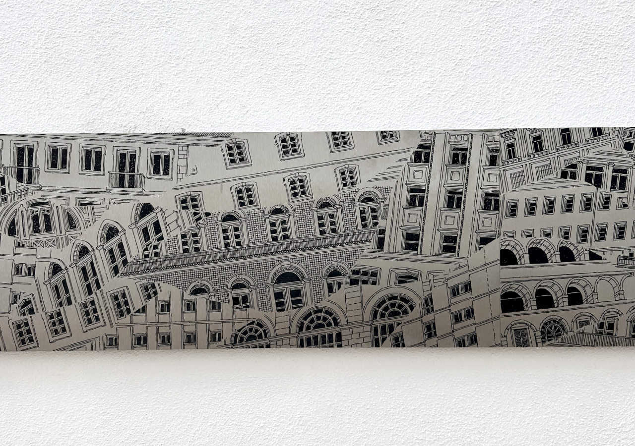 Draw by hand and then engraved in stainless steel plates, Eidos is a drawing that represents five themes from Tomar's urban landscape.