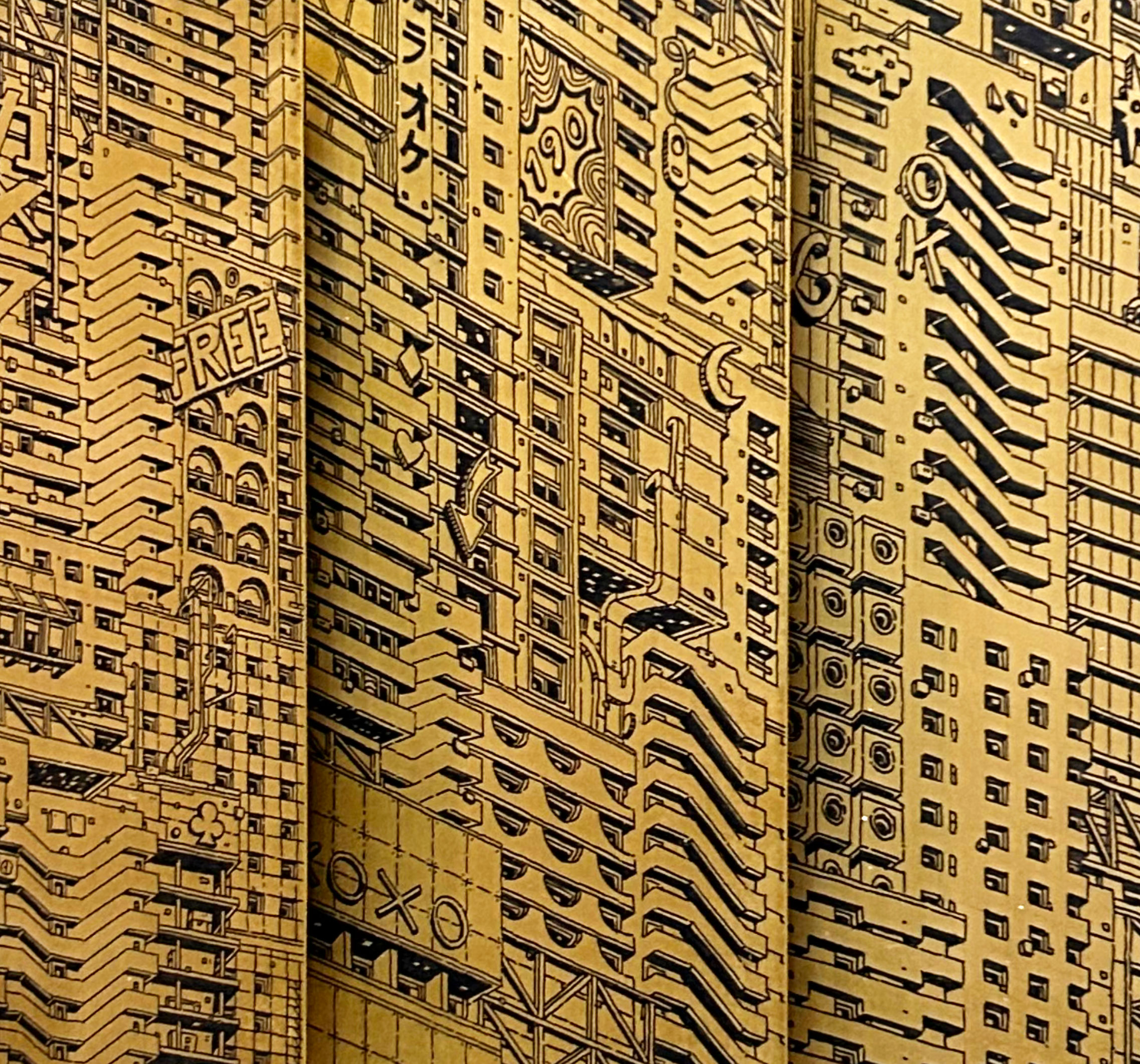 Drawn by hand in acrylic ink upon metal, the artworks reflect a consuming fascination with the density of the contemporary city. Suspended between drawing and a sculptural gesture unfolding across the plane, this work reveals a graphic inquiry into the urban landscape — a meditation oscillating between an obsession with detail and the foreboding of dystopia.