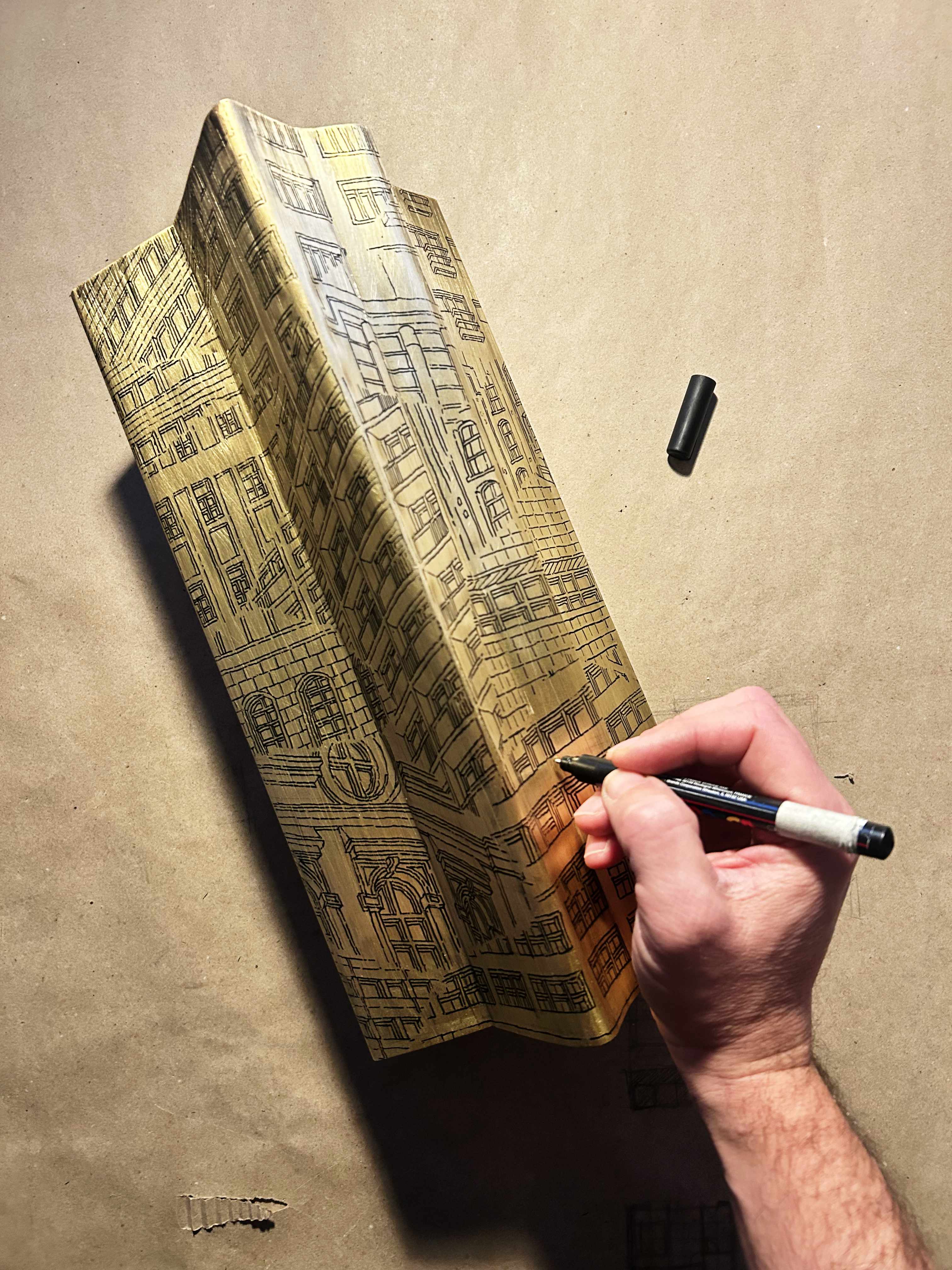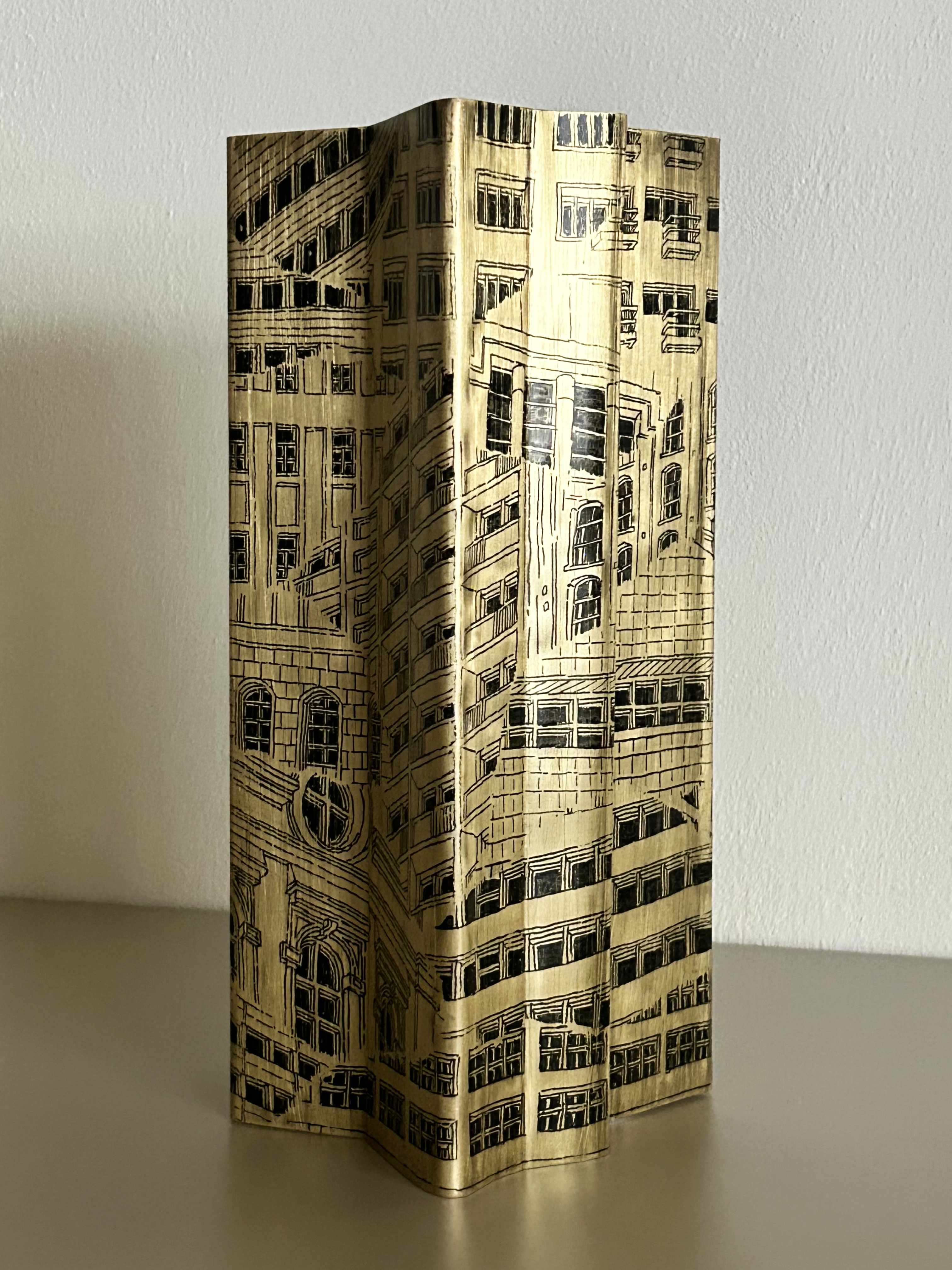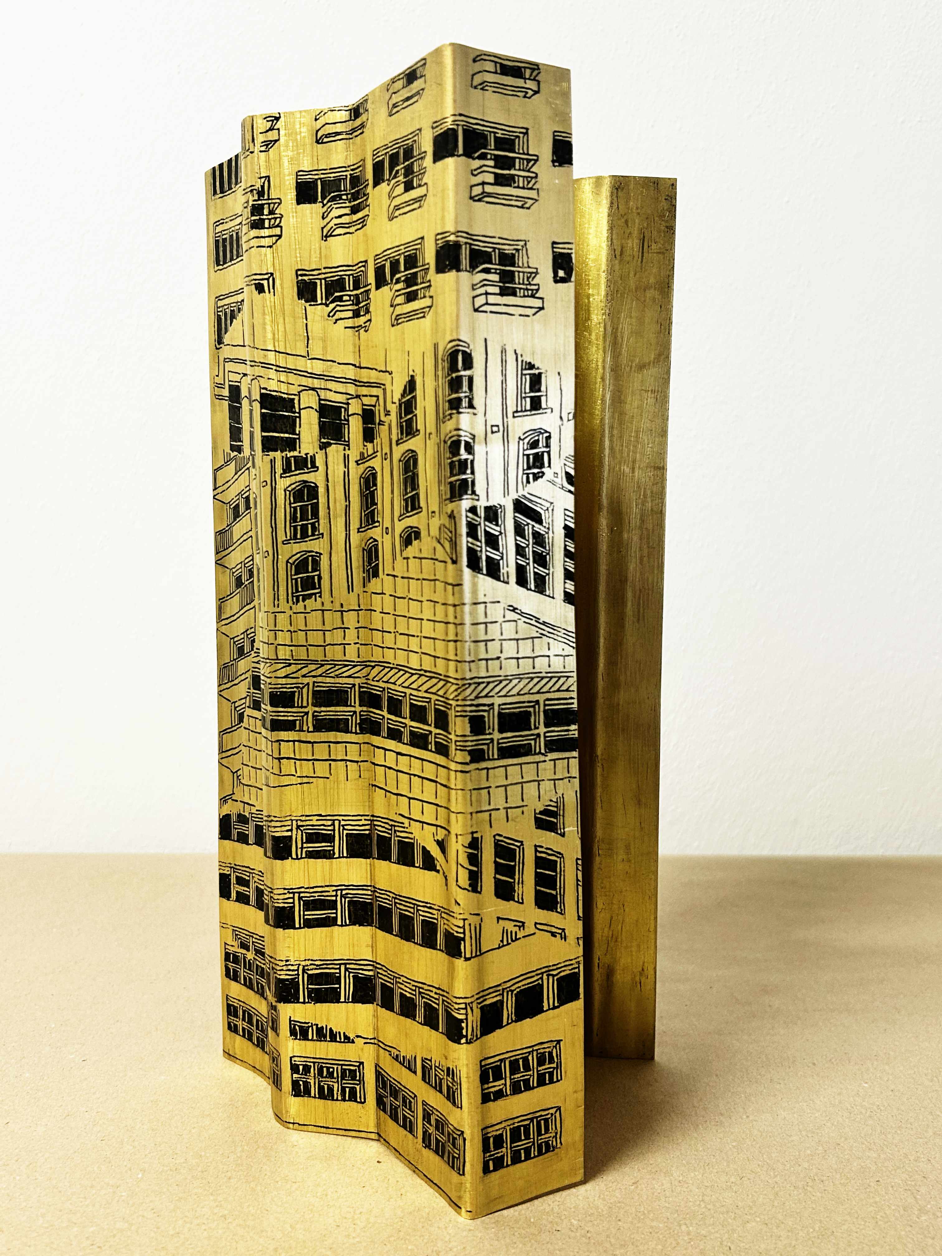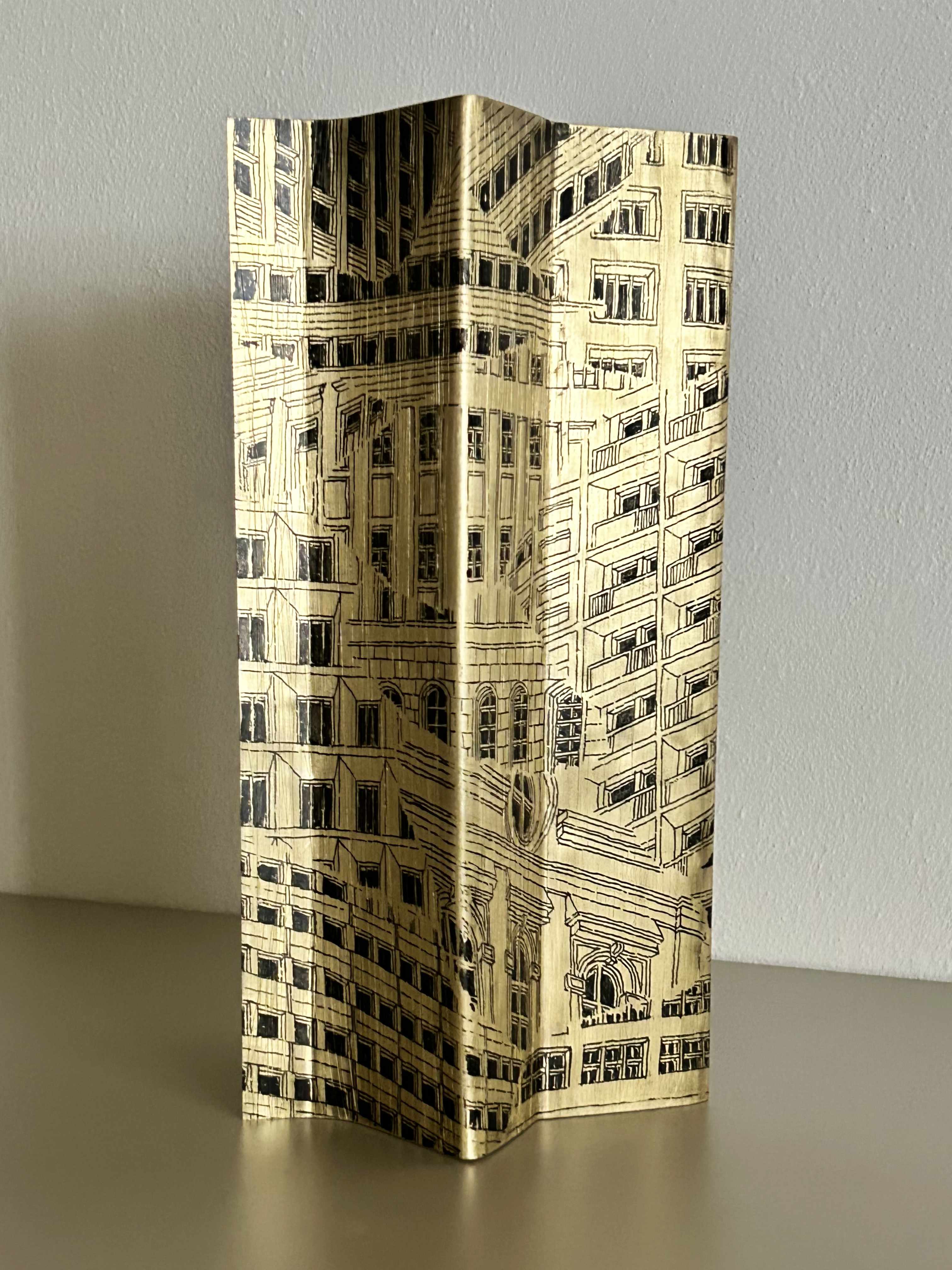 Hand drawn directly with acrylic ink on the metal surface, these stacked sequences of buildings reflect on the quintessential urban typology of the contemporary city.