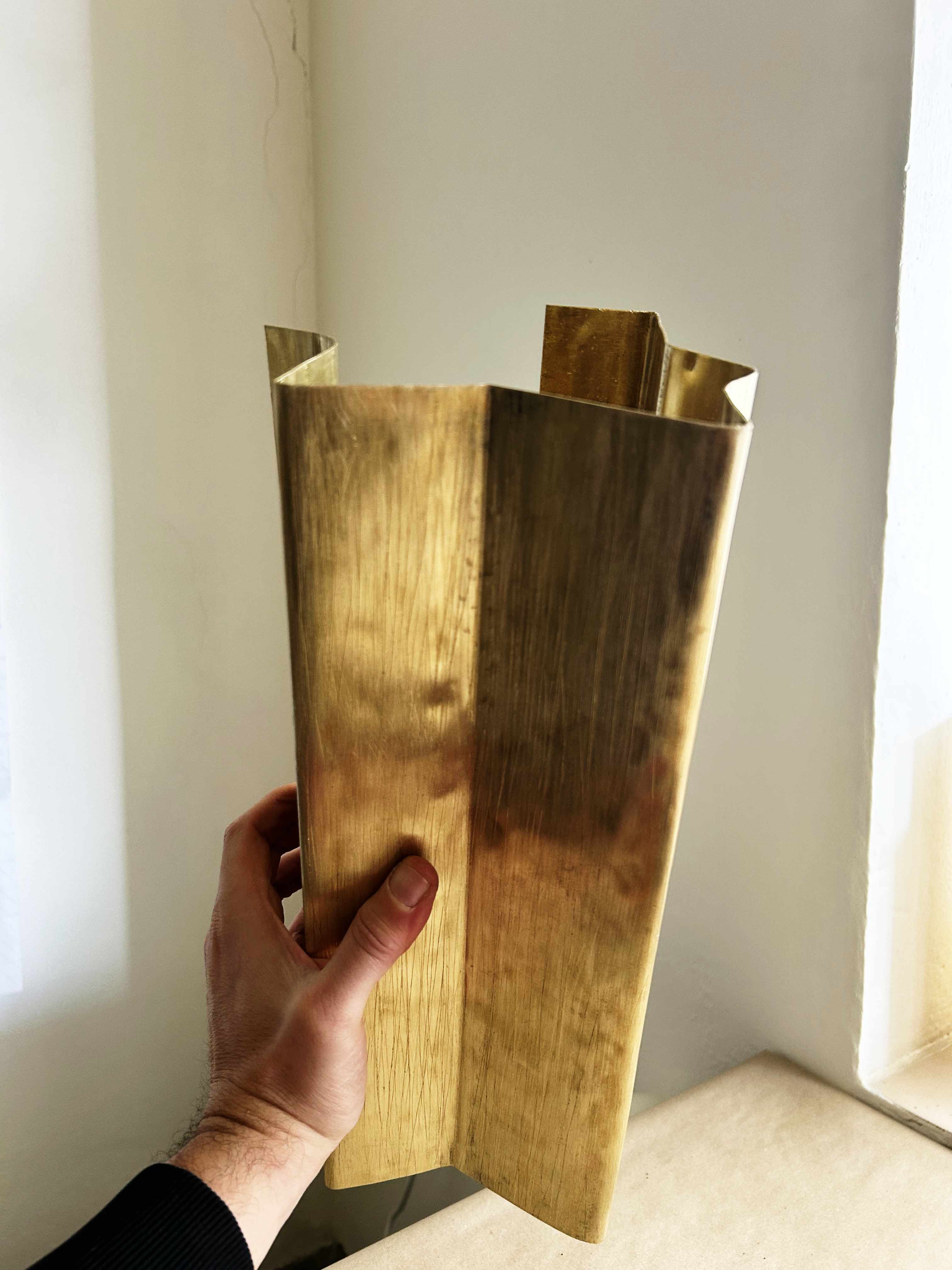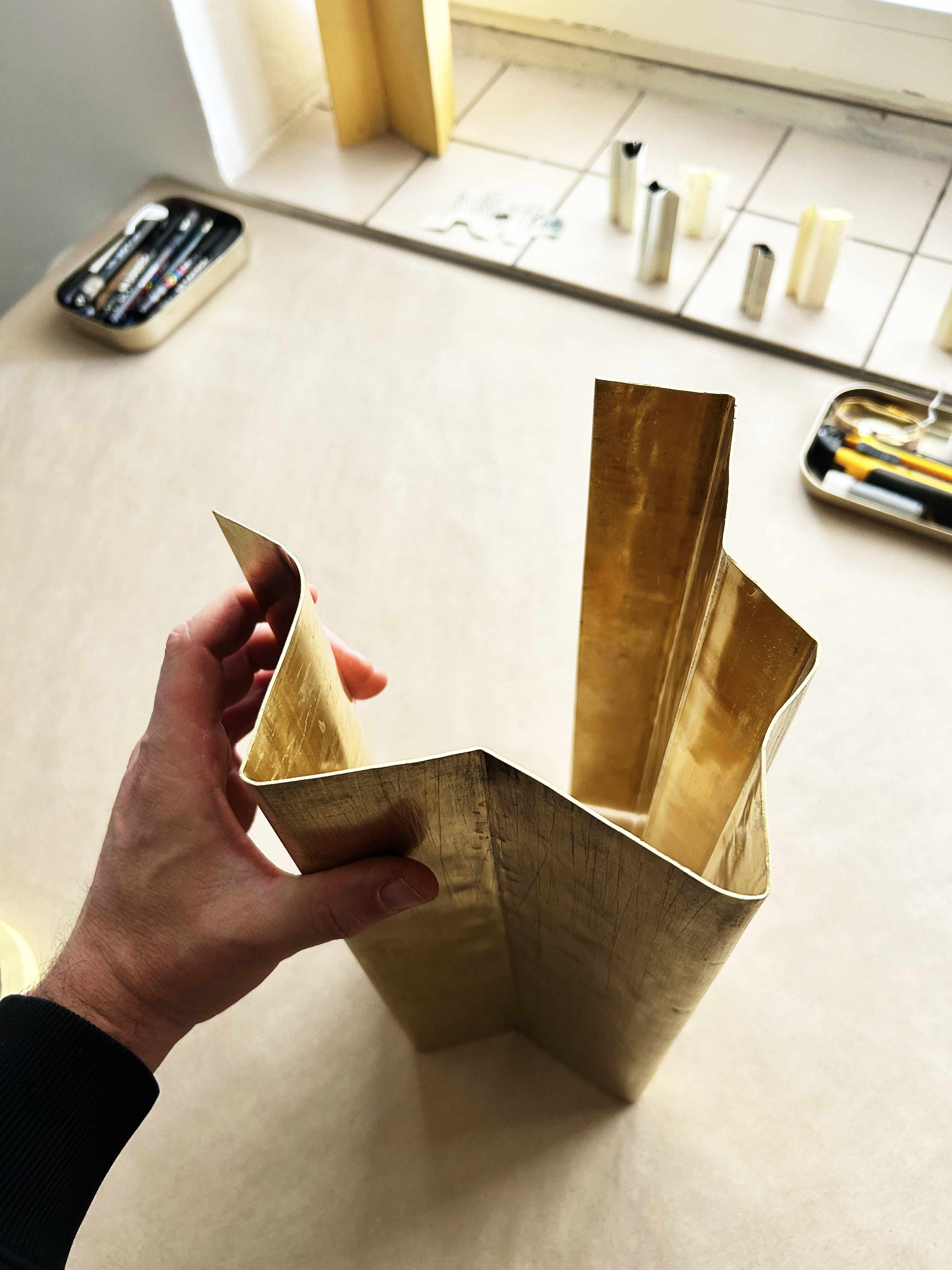 Acrylic ink on folded brass